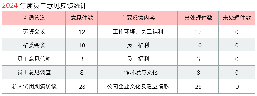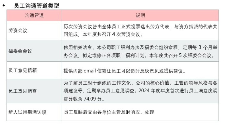 广闳科技戮力打造员工与公司之间和谐对等的沟通平台,建立多元且畅通的沟通管道,包含劳资会议、福委会、员工意见信箱、员工意见调查及其它管理机制等,让员工的意见能够得到 充分的表达同时获得回应及改善,进而消弭劳资双方对立及冲突的可能性,拉近劳资双方距离,以促进劳资双方关系共为稳定与和谐。