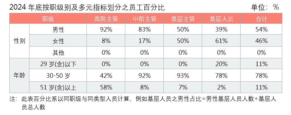 本公司员工男女性占比分别为54%及46% ,以年龄层30-50岁之员工居多,占总人数78% 。另依法聘雇身心障碍者1人,且为落实本公司多元平等之理念,亦聘雇具原住民身分之员工0人。为了促进员工多元化,我们广纳全球海外菁英,员工组成共来自2个国籍,非据点当地员工约占0% ;为促进多元任用同时发展海外营运市场,海外员工占总员工人数达12% 。而本公司高阶主管以当地员工为主,本年度100%高阶主管为当地居民,仅0位主管为外国籍。