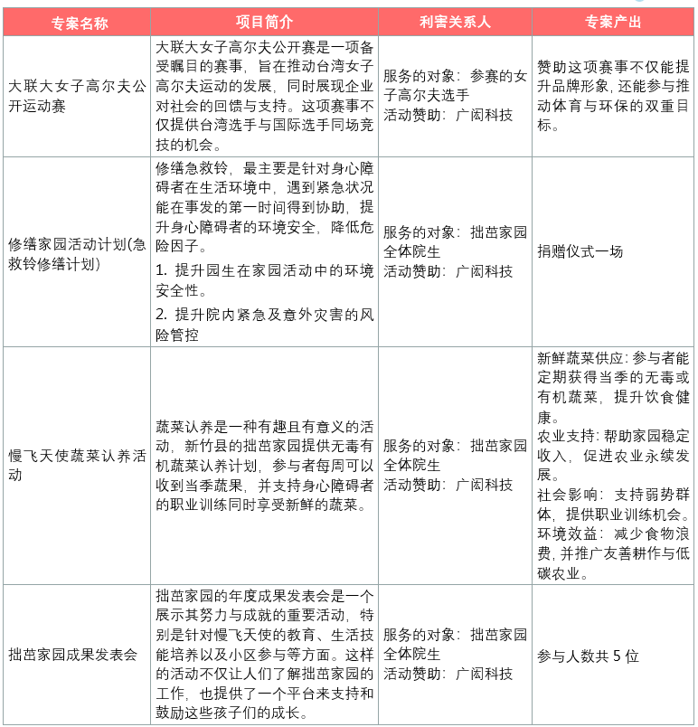 广闳科技秉持着 「取之于社会,用之于社会」理念,在追求公司营运成长的同时,不忘对社会贡献一份心力,秉持着尊重生命、关怀弱势的精神,散播爱的种子来回馈社会,透过捐款及资源的传递,表达对弱势者之关怀;亦投入资源降低环境冲击、宣导环保意识,以善尽环境责任。不定期参与社会服务工作,提升社会参与、贡献与服务,积极对外参与社会急难救助及社会回馈。
